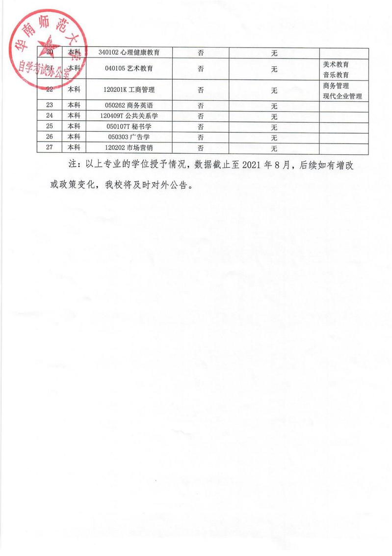 日前,华南师范大学继续教育学院官网发布了《华南师范大学关于高等教育自学考试本科主考或助学专业学位授予情况的公告》的文章,告知按规定2022年9月后将有9个专业将无法授予成人学士学位证书。具体专业有:教育管理、心理健康教育、艺术教育、工商管理、商务英语、公共关系学、秘书学、广告学、市场营销共9个专业。考生个人自愿选择是否报读,符合毕业规定的考生只能获取广东省自学考试委员会颁发、华南师范大学附署盖章的毕业证书,不再授予华南师范大学成人学士学位证书。