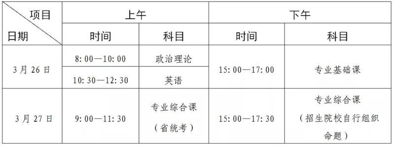 专业综合课分省统一命题和院校自行命题两种。部分专业(具体专业见附件5)的专业综合课实行省统一命题考试,其他省级统考没有覆盖的专业,招生院校可选择用相近的省统考专业综合课替代,也可自行组织命题。招生院校自行组织命题的专业综合课在省招生办规定的统一时间举行考试,考试时间安排在省统考科目后。